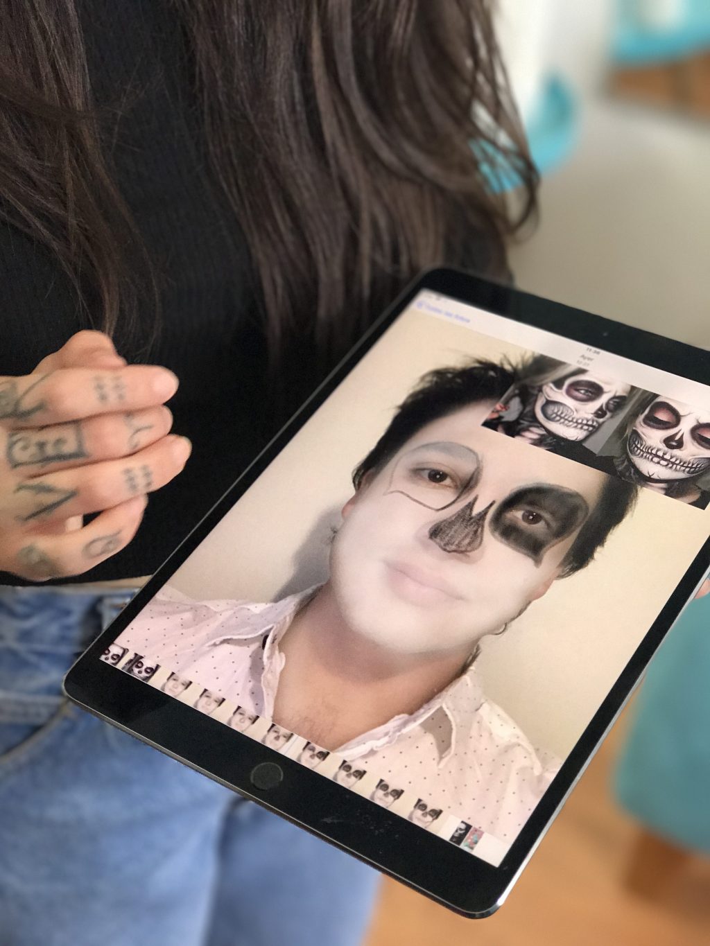 La Valentina Davila, maquilladora y youtuber nos mostró un maquillaje, que realizó en vivo, que boceteó en su iPad Pro, usando la aplicación SketchBook. Ahí pudo usar distintas capas para crear un Face Chart (dibujo del rostro que se colorea con maquillaje real) y crear el look perfecto y simple para Halloween.