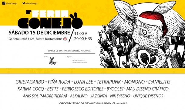 ¿Qué tienen en común billeteras de papel reciclado, poleras serigrafiadas, originales en acuarela, misteriosos conejos de trapo y asombrosas caricaturas en vivo? Todo esto y muchos otros productos de jóvenes artistas del diseño y la ilustración nacional, podrán encontrarse este sábado 15 de diciembre en Feria Conejo “Especial Navideño”, que se realizará en La Cueva del Conejo, General Jofré 125, a pasos del Metro Bustamante.