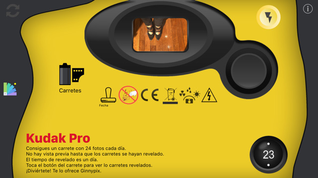Bueno, la app Kudak pro imita una de estas, con 24 oportunidades de fotos por día que debes ver por un ínfimo visor, pues “el rollo es de 24” y se demora 1 día en revelarte las imágenes, simulando que llevaste el rollo a la tienda.