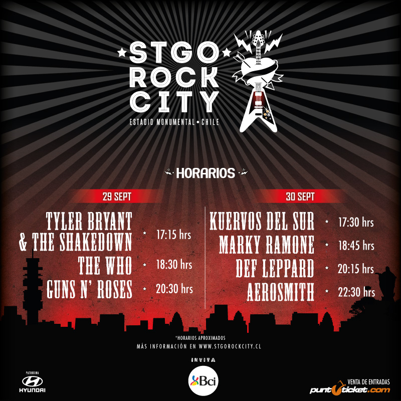 * Los horarios son aproximados. Cualquier modificación será comunicada a través de las plataformas oficiales de Stgo Rock City.