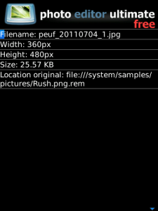 En fin, mucho de mi vida y poco de lo que nos gusta: apps gratuitas para BB. Hoy les hablaré de Photo Editor Ultimate free, una app que, claramente no es imprescindible, pero para una que le gusta andar por la vida editando cuanta foto se le pase por delante, es útil para reemplazar al Photoshop cuando no estamos cerca de él.